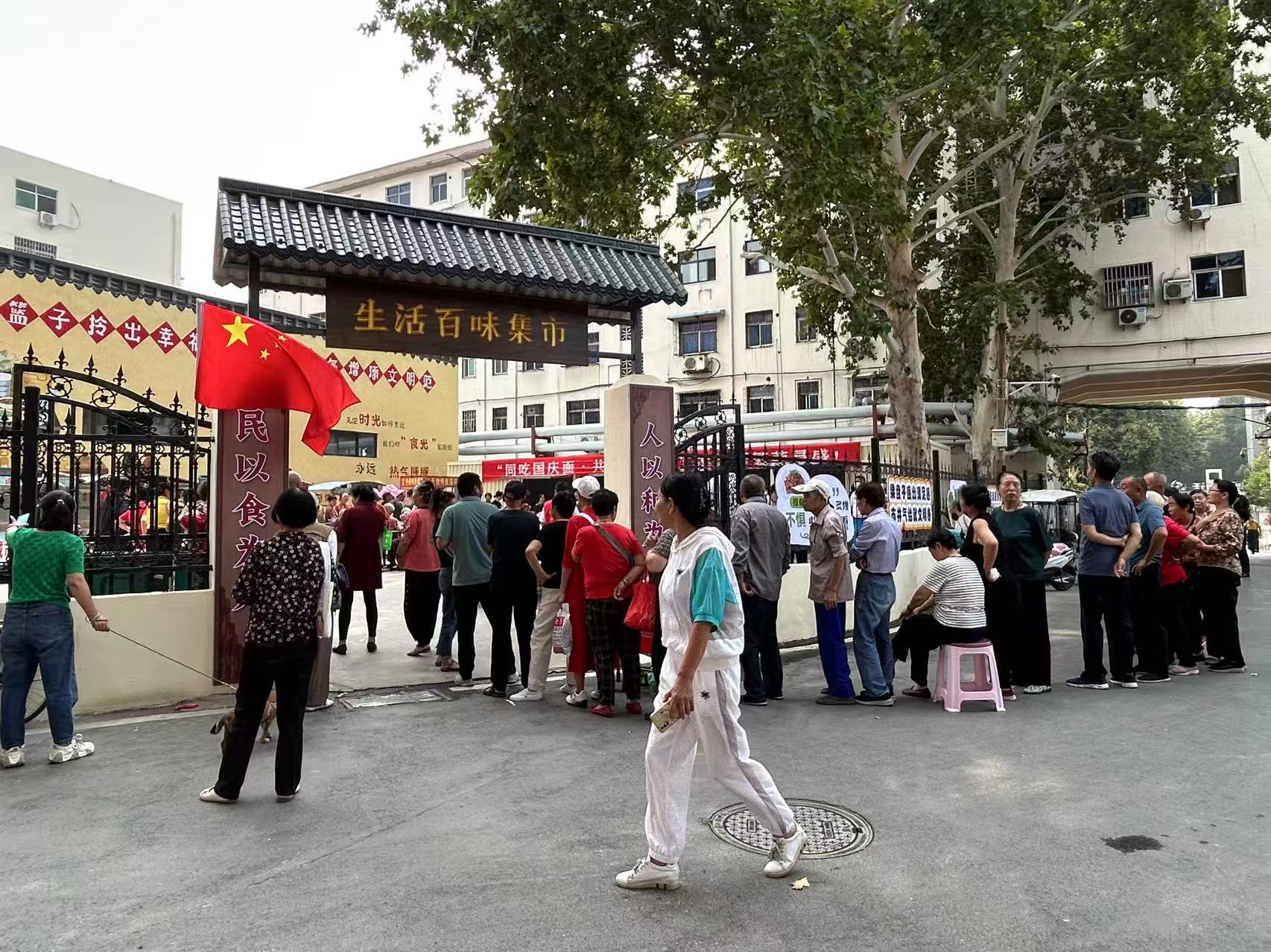 记者注意到,在社区楼院空地,有一个1000多平方米的生活百味集市,既让商贩有地方经营,又让百姓购物更便利,过道两侧,“柴米油盐酱醋茶,民生至味皆入画”等宣传展板,烟火气十足。