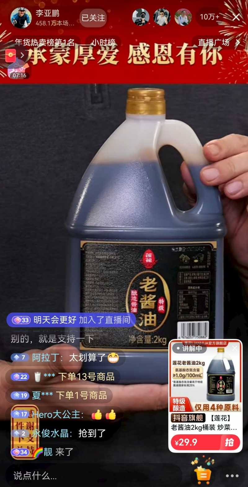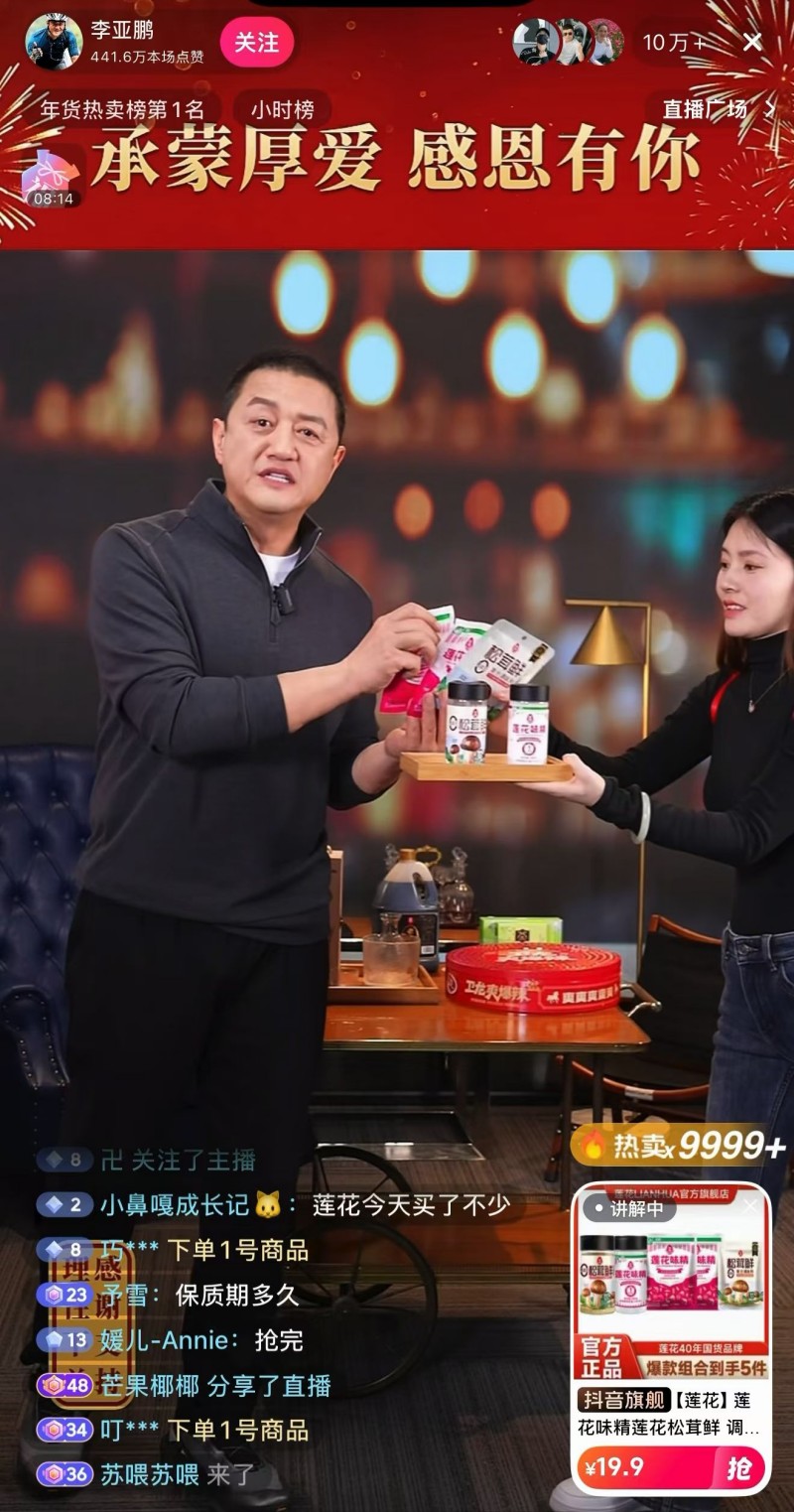 【大河财立方 记者 史冰倩】 2月8日晚间7点,李亚鹏抖音直播间准时开启直播,直播间人气一路飙升,在线观看人数突破10万+,直接登顶抖音年货热卖榜,购物车内莲花味精、卫龙辣条等多款商品链接迅速售罄,直播间抢购氛围拉满。