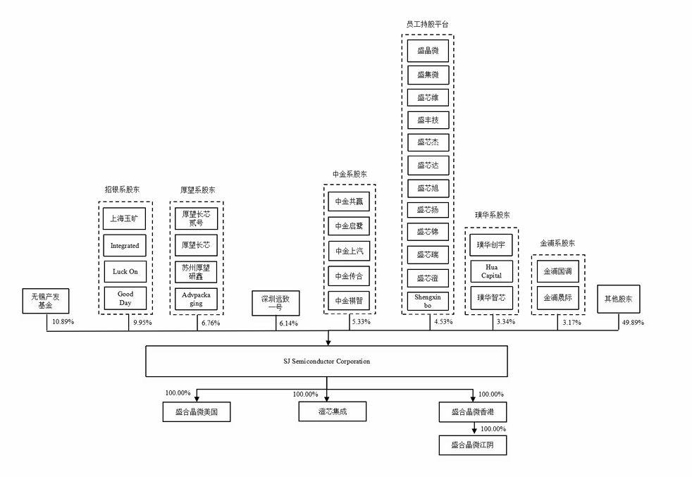 从股权架构来看,最近两年内,盛合晶微无控股股东且无实际控制人。截至招股书签署日,盛合晶微第一大股东无锡产发基金持股比例为10.89%,第二大股东招银系股东合计控制股权比例为9.95%,第三大股东厚望系股东合计持股比例为6.76%,第四大股东深圳远致一号持股比例为6.14%,第五大股东中金系股东合计持股比例为5.33%。公司任何单一股东均无法控制股东会且不足以对股东会决议产生决定性影响。