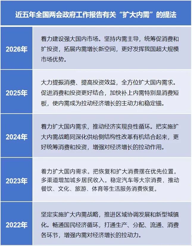 扩大内需并非新鲜事,但其相关部署在历年政府工作报告中持续深化、不断升级。