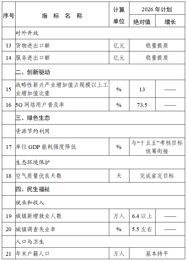 2026年经济社会发展的主要预期目标是:全市生产总值增长6%左右,在实际工作中努力争取更好结果;规模以上工业增加值增长7.5%左右,固定资产投资增长6%左右,社会消费品零售总额增长6.5%左右,一般公共预算收入增长5%左右,城镇调查失业率5.5%左右,居民消费价格涨幅2%左右,居民收入增长与经济增长基本同步,粮食产量140亿斤以上,单位生产总值碳排放与“十五五”考核目标统筹衔接。