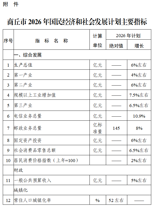 附件:商丘市2026年国民经济和社会发展计划主要指标