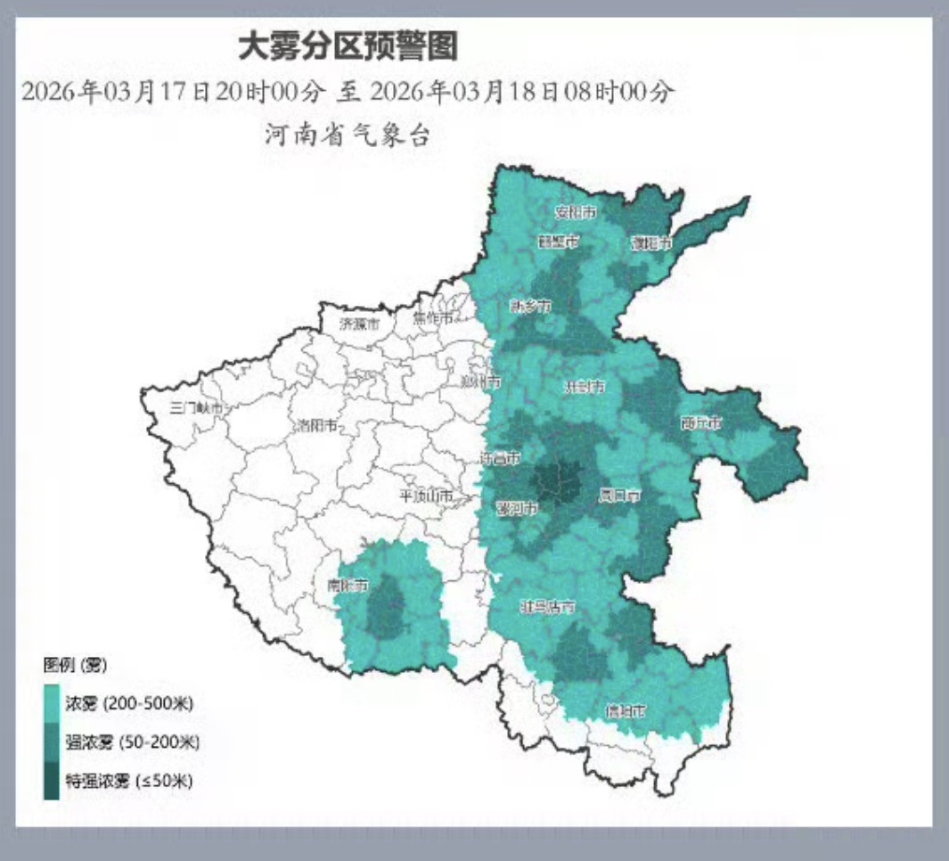 河南省气象台3月17日17时30分发布大雾黄色预警:预计17日20时至18日8时,安阳、鹤壁、濮阳、新乡、郑州东部、开封、许昌中东部、漯河、商丘、周口、南阳中东部、驻马店、信阳北部和东部将出现能见度低于500 米的浓雾,部分县(市、区)能见度低于200 米,局地低于50 米。据河南省高速公路路警联合指挥中心,受到大雾天气影响,截至3月18日8时,我省多条高速公路禁止车辆上站。具体如下。