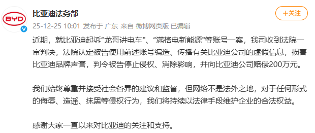 12月25日,比亚迪法务部发文称,近期,就比亚迪起诉“龙哥讲电车”、“满格电新能源”等账号一案,公司收到法院一审判决,法院认定被告使用前述账号编造、传播有关比亚迪公司的