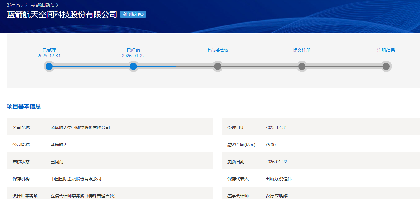 蓝箭航天于2025年7月启动IPO,拟在科创板上市;2025年12月31日,上交所官网显示,蓝箭航天IPO申请获受理,公司拟募集资金75亿元。