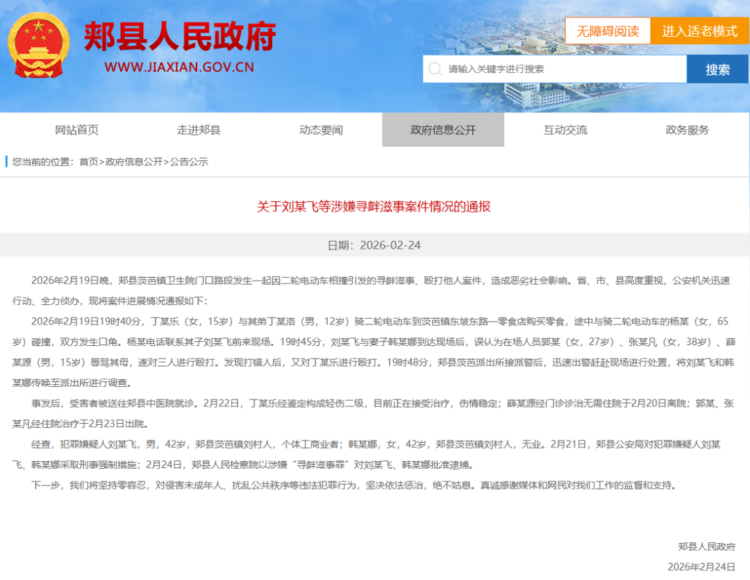 2月24日,郏县人民政府发布《关于刘某飞等涉嫌寻衅滋事案件情况的通报》: