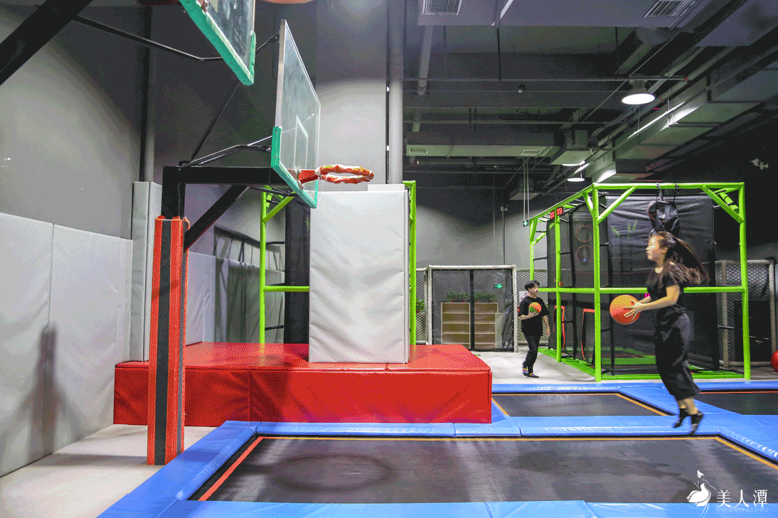 这里是大佬炫技区,蹦面弹性更加强大,小美试了试,确实与自由蹦床区的感觉 不同。对于专业级教练来说,飞檐走壁是轻而易举的事,崇拜到不行,小美负责 在旁边为他们鼓掌。