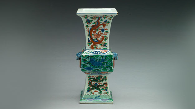 清仿明大明万历年制款青花五彩云龙纹双耳方花觚