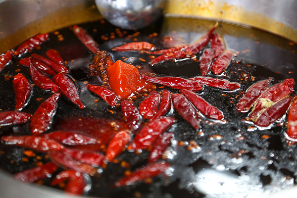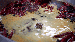 辣椒之外最重要的角色就是牛油,牛油除了提供香味之外,还能在熬制过程中不断吸收花椒辣椒葱姜蒜等食材的味道。整个炒料过程要不停搅拌,并在特定时间点加不同的料,每个环节的松懈都会导致前功尽弃。