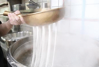 不要小瞧了这碗粉,煮这个粉真的很考验技术,粉软了没劲道,粉 硬了磕牙。硬是要煮的软硬合适,入口嫩滑才能称得上一声正宗。 肥肠粉用的红薯粉都是纯手工揉出来的,这样出的水粉才能够有韧 劲。出水粉,是技术活,也是力气活,师傅来自成都,手法娴熟, 敲打出来的粉条粗细均匀。将粉团装入漏勺,一手高举漏勺,一手 握拳,用力捶打粉团,在打的过程中还要不停地变动位置,使粉落 得均匀,不会成团;每漏好一勺粉团,就需要迅速将锅中的粉条捞 出过凉,并泡入凉水保存。