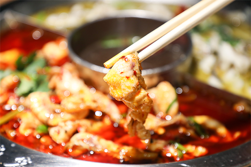 在滚烫的麻辣火锅里,七上八下转一圈,沾上红油的香气,麻辣爽口、 脆嫩入味,特别过瘾。