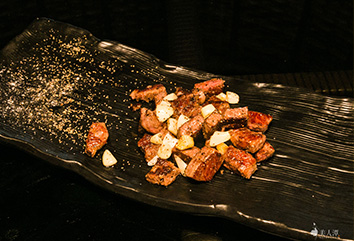 据说,最能考验铁板师父功力的一道食材之一,就是铁板煎 鸡骨架。去骨的鸡胸肉横剖到底后收拾成一片蝴蝶状的肉片, 以秘制酱料腌制入味后轻裹淀粉。铁炉升温后撒油,轻抬肉 块至铁板正中,小铲平压,肉块立马滋啦作响,翻身的时机 和程度一定要恰到好处,这样才能外焦里嫩,又不失鲜鸡肉 中原汁原味的肉香。