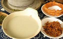 鲜豆汁:它是做绿豆粉或团粉的粉浆,经过发酵而成。实用前,用锅煮沸。喝时,有一种特殊的酸味……